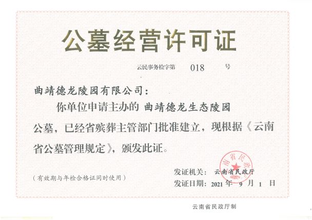 曲靖德龍陵園有限公司于2015年3月26日成立,注冊資金1160萬元,系曲靖市紅十字會(huì)團(tuán)體會(huì)員單位。公司經(jīng)營范圍:殯葬設(shè)施經(jīng)營;殯儀用品銷售;殯葬服務(wù);禮品花卉銷售;休閑觀光活動(dòng)。